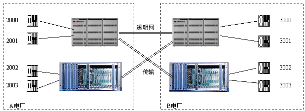 適用范圍:這種應用適用于對電話系統(tǒng)安全性要求嚴格的場合,如電力系統(tǒng)行政交換機與調(diào)度交換機就可以以上述方式實現(xiàn)備份,從而實現(xiàn)行政或調(diào)度交換機某一臺不能工作時,依然可以通過備份系統(tǒng)打電話。