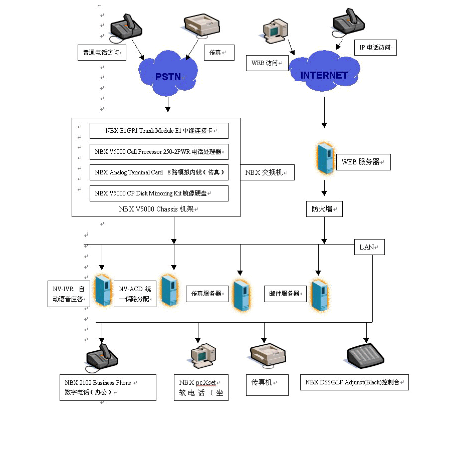 北京晨報的客戶服務(wù)中心項(xiàng)目是一個集呼叫中心與辦公系統(tǒng)于一體的語音、數(shù)據(jù)服務(wù)平臺。通過一條E1中繼線與外部電話網(wǎng)相聯(lián)。內(nèi)部使用50部數(shù)字電話進(jìn)行處理辦公業(yè)務(wù),10個呼叫中心坐席采用計算機(jī)的軟電話(pcXset)實(shí)現(xiàn)與客戶的交談,傳真服務(wù)器通過NBX所提供的8條模擬內(nèi)線與外界互通。