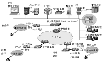 如圖所示,中國工商銀行甘肅省分行采用的具體方案是:在全省的其它地市,采用Cisco路由器和語音接入卡,所有地市行只負責語音接入,設立當?shù)氐恼Z音網(wǎng)關作為話務接入點,負責當?shù)乜蛻舻脑拕战尤;當(shù)乜蛻舻腎VR服務和人工服務,利用當?shù)氐腃isco路由器,通過VoIP技術轉(zhuǎn)接至省中心蘭州的呼叫中心,由省中心的軟件IP