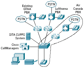 航空公司的撥號計劃——該機場正在為各個航空公司部署不同的分區(qū)和撥號計劃。在缺省情況下,GTAA域中有五個數(shù)字撥號,但是當每個航空公司登陸到登機口時,他們希望從他們自己的PBX或者Centrex電話系統(tǒng)獲取線路。這意味著各個航空公司可能擁有重復(fù)的電話號碼,以及關(guān)于哪些電話可以呼叫哪些目的地的不同規(guī)則。這些計劃還包括利用IP技術(shù),與已經(jīng)在兩年前部署思科IP電話的AC