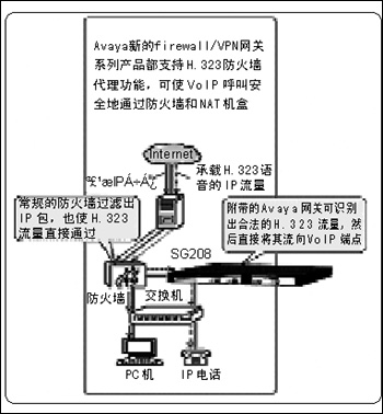 通常情況下,使用網(wǎng)絡(luò)地址解析(NAT)技術(shù),H.323流量都不能順利地通過(guò)防火墻或路由器設(shè)備。NAT利用掩碼將用戶(hù)的IP地址隱藏到了路由器中,用戶(hù)不得不向公共防火墻開(kāi)放端口,以允許VoIP流量(如IP電話(huà)呼叫、微軟的網(wǎng)絡(luò)會(huì)議等)進(jìn)入到企業(yè)內(nèi)部。而Avaya宣稱(chēng),這種新的H.323應(yīng)用代理能識(shí)別通過(guò)NAT設(shè)備的IP和H.323地址,自動(dòng)打開(kāi)和關(guān)閉防火墻端口(不需要管理),使IP呼叫流量能安全地通過(guò),不會(huì)給網(wǎng)絡(luò)留下漏洞。