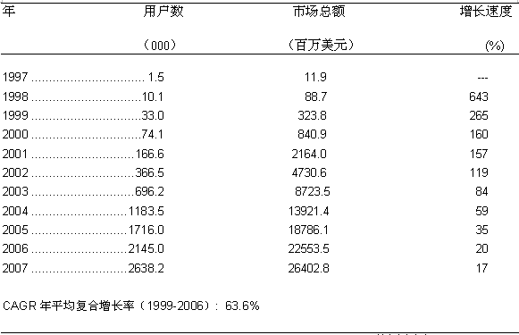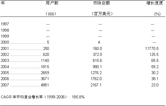 圖一: 美國寬帶無線固定接入市場的增長歷史和預測 1997-2007