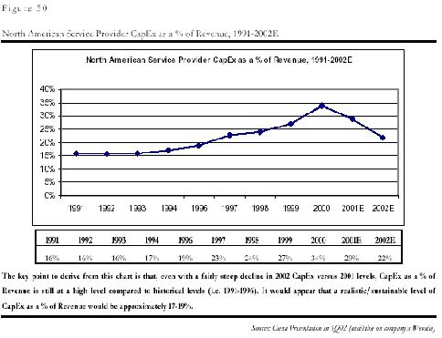 和中國的問題一樣,制造商的問題是電信服務(wù)企業(yè),即運營商的投入減少造成的。由于上世紀末互聯(lián)網(wǎng)和電子商務(wù)泡沫的虛假繁榮的影響,各運營商都嚴重高估了市場需求,認為需求是會隨著通信能力的增強無限增加,因此市場規(guī)模是會無限擴張的,他們在缺乏對最終用戶需求的深入分析的前提下,普遍在基礎(chǔ)設(shè)施的建設(shè)上進行了超大規(guī)模的投入,其基礎(chǔ)設(shè)施建設(shè)投入在收入中的比例一度在2000年從平均的15%達到了創(chuàng)記錄的35%!