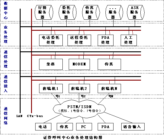 另一種方案是PDA和證券營(yíng)業(yè)部前端機(jī)(實(shí)際就是電話委托前端機(jī))采用FSK通訊方式,使用電話委托的通道來(lái)完成所有的委托查詢。這種方式的速度快,信息容量大,保密性強(qiáng),而且營(yíng)業(yè)部不需單獨(dú)申請(qǐng)電話線路,PDA和電話委托線路可動(dòng)態(tài)分配,使其電話線路得到最大限度的利用。另外,營(yíng)業(yè)部對(duì)外形象也好,只用一個(gè)號(hào)碼就可讓股民完成電話委托、PDA委托等多種委托方式,給股民帶來(lái)了方便。不過(guò)這種方式需要得到電話語(yǔ)音卡提供廠商的產(chǎn)品技術(shù)支持,語(yǔ)音卡必須同時(shí)支持標(biāo)準(zhǔn)的DTMF和FSK的方式,卡上有充足的能力來(lái)處理兩種方式,在語(yǔ)音處理卡的底層驅(qū)動(dòng)應(yīng)該將電話和PDA的委托區(qū)別開來(lái),目前市場(chǎng)能夠完全支持這種應(yīng)用的只有深圳市東進(jìn)通訊技術(shù)股份有限公司的產(chǎn)品,東進(jìn)技術(shù)的新一代PCI系列語(yǔ)音卡數(shù)字卡和模擬卡都完全采用DSP(數(shù)字信號(hào)處理器)架構(gòu),卡上有專用DSP來(lái)處理DTMF和FSK的收發(fā),是目前PDA委托前端的最好選擇;這種方案還應(yīng)該得到證券電話委托系統(tǒng)的開發(fā)商的支持,在電話委托系統(tǒng)里增加處理PDA委托的功能。目前恒基偉業(yè)的“股靈通”就是采用這種方式。