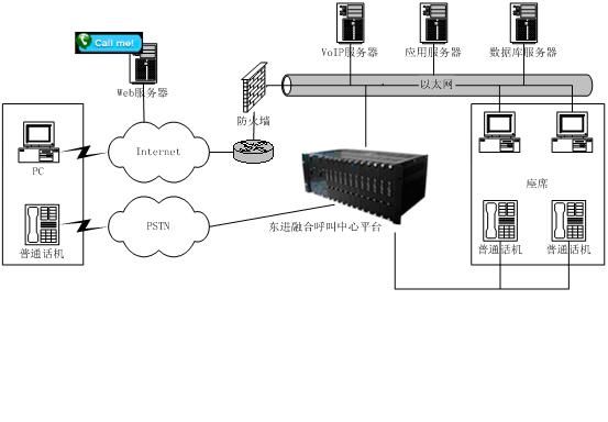 to Talk)”發(fā)展到“點(diǎn)擊到交談(Click to Talk)”,通過(guò)Internet可以提供IP電話語(yǔ)音呼叫、Call Back、IP傳真、IM、E-mail等功能,擴(kuò)展了通信渠道,一方面用戶可以實(shí)現(xiàn)免費(fèi)接入到呼叫中心,另一方面企業(yè)能夠向更多的客戶提供優(yōu)質(zhì)、方便的服務(wù)資源,而且由于這些資源的價(jià)格相對(duì)傳統(tǒng)通信便宜,使企業(yè)為客戶提供全國(guó)、乃至于全球服務(wù)成為可能,提高了企業(yè)客戶服務(wù)水平,增強(qiáng)了企業(yè)競(jìng)爭(zhēng)力。東進(jìn)互聯(lián)網(wǎng)呼叫中心系統(tǒng)結(jié)構(gòu)如圖所示: