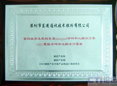 10月23日,中國(guó)國(guó)際通信設(shè)備技術(shù)展覽會(huì)國(guó)際通信展覽會(huì)開幕當(dāng)天,由通訊產(chǎn)業(yè)報(bào)社主辦的2007通信產(chǎn)業(yè)方案產(chǎn)品精品評(píng)選活動(dòng)頒獎(jiǎng)典禮隆重舉行,東進(jìn)技術(shù)的“面向業(yè)務(wù)流程的東進(jìn)Seegoe呼叫中心解決方案”榮獲2007最佳呼叫中心解決方案獎(jiǎng)。