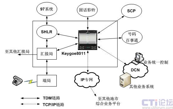 東進(jìn)Keygoe系列多媒體交換機(jī)通過高密度7號信令鏈路支持、大容量的時隙交換、多網(wǎng)絡(luò)接口和語音處理完成不同業(yè)務(wù)系統(tǒng)的7號信令的接續(xù)和解析、話音交換和協(xié)議轉(zhuǎn)換。對于已經(jīng)進(jìn)行固網(wǎng)智能改造的電信網(wǎng)絡(luò),可以在匯接局將各種業(yè)務(wù)平臺連接至東進(jìn)Keygoe系列多媒體交換機(jī),并通過東進(jìn)Keygoe系列多媒體交換機(jī)連接至SHLR,實現(xiàn)多業(yè)務(wù)平臺上的多業(yè)務(wù)觸發(fā),同時通過SHLR與97系統(tǒng)以及其他業(yè)務(wù)支撐系統(tǒng)連接起來,實現(xiàn)業(yè)務(wù)的統(tǒng)一批價、鑒權(quán)和計費(fèi);對于沒有進(jìn)行固網(wǎng)智能化改造的電信網(wǎng)絡(luò),可以在匯接局通過東進(jìn)Keygoe系列多媒體交換機(jī)和SSP提供基于TCP/IP層面的業(yè)務(wù)平臺互聯(lián)。