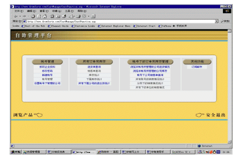 ebanswers分銷系統(tǒng)的一個重要特色就是自助管理平臺,用戶可以在這個平臺中完成絕大部分管理、查詢和統(tǒng)計(jì)的工作。自助管理平臺主要有四大部分組成:帳號管理、公司下訂單和庫存管理、帳號下訂單和庫存管理、其他功能。其中帳號管理主要是管理與公司和帳號有關(guān)的各類信息,公司下訂單和庫存管理、帳號下訂單和庫存管理這兩個部分主要是用來查詢和統(tǒng)計(jì)各項(xiàng)信息的。