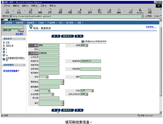 。。比如現(xiàn)在有一個新客戶黃航的電話13082856110呼入Ebanswers呼叫中心,console控制臺接收到這個電話號碼以后,會產(chǎn)生一個URL鏈接地址tel=217,以參數(shù)的形式附在調用的CRM頁面http://ecrm/crm2/default.asp?retURL=http://ecrm/crm2/search/searchtel_xml.asp后面,當話務員登錄以后,就會彈出相應的添加新線索頁面,話務員填寫好相關信息后,按下"保存"按鈕就可以建立新線索了。