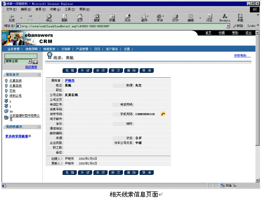 Ebanswers CRM系統(tǒng)去激活相關客戶資料的IE頁面進行處理:如果此號碼數(shù)據(jù)庫中存在,則顯示此人的信息,如果不存在,則顯示CRM中添加新線索的頁面。而Ebanswers