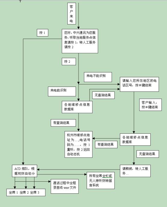 在中興通訊呼叫中心流程設(shè)計上充分體現(xiàn)了CTI技術(shù)以及數(shù)據(jù)庫技術(shù)等IT技術(shù)與星際先進(jìn)的管理理念的融合。該流程的設(shè)計保證將主動提高服務(wù)品質(zhì)的工作集中于對呼叫者最重要的環(huán)節(jié)――對維修網(wǎng)點信息的咨詢上。它為所有呼叫者提供了詳細(xì)、精煉、基本的高品質(zhì)電話服務(wù),同時又根據(jù)電話區(qū)號提供了有針對性的咨詢服務(wù)。
