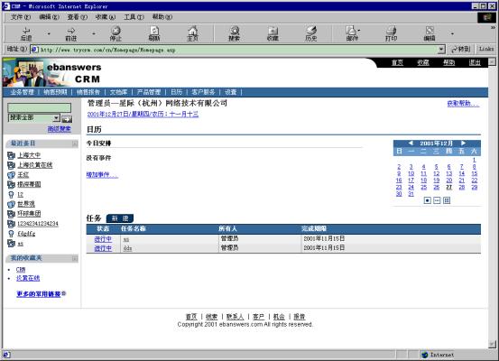 星際(杭州)網(wǎng)絡(luò)技術(shù)有限公司(www.ebanswers.com)研發(fā)的Ebanswers eCRM是中國(guó)第一套基于新一代網(wǎng)絡(luò)標(biāo)準(zhǔn)語(yǔ)言――XML的客戶關(guān)系管理系統(tǒng),整個(gè)系統(tǒng)提供了完善的企業(yè)級(jí)客戶關(guān)系全面解決方案,包含可無(wú)縫整合又可獨(dú)立運(yùn)行的三個(gè)功能組件:銷售,營(yíng)銷,服務(wù)流程自動(dòng)化軟件系統(tǒng);客戶溝通集成信息化方案;深層商業(yè)智能分析。