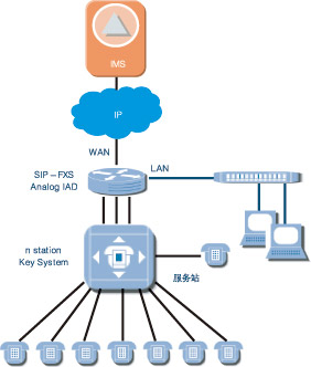 適用于支持模擬線的小交換機(jī),經(jīng)SIPIAD設(shè)備將模擬線路轉(zhuǎn)換為基于IP的SIP信令流和媒體流,接入IMS系統(tǒng)。經(jīng)愛立信測(cè)試認(rèn)證過的IAD產(chǎn)品有Mediatrix、Audiocodes、Linksys等。