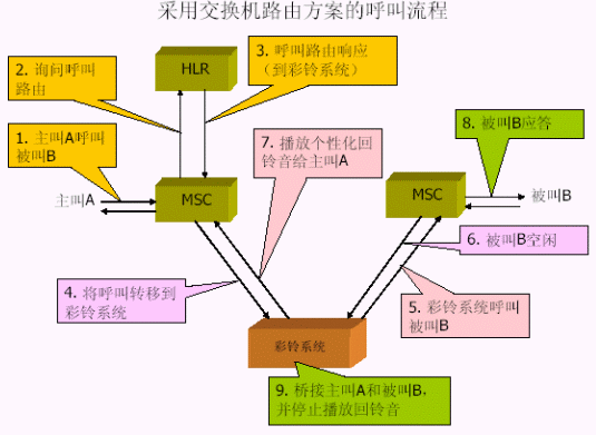 1. 交換機方式對現(xiàn)有的移動交換機進(jìn)行了流程改造,并添加了彩鈴智能外設(shè)進(jìn)行業(yè)務(wù)流程控制和業(yè)務(wù)數(shù)據(jù)維護(hù)