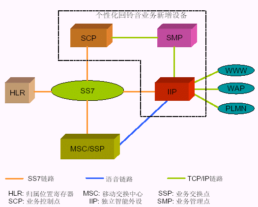 3. 智能網(wǎng)方式使用移動智能網(wǎng)中的信令控制節(jié)點(SCP)實現(xiàn)智能業(yè)務(wù)的業(yè)務(wù)邏輯,新增的智能外設(shè)用于為用戶提供回鈴音和用戶管理功能。 個性化回鈴音業(yè)務(wù)是基于智能網(wǎng)系統(tǒng)的一個新業(yè)務(wù),在智能網(wǎng)中增加新的業(yè)務(wù)控制點(SCP)和獨立智能外設(shè)(IIP)。為此只需要為此業(yè)務(wù)加入基于Intel平臺的SCP和IP即可,前者是智能網(wǎng)體系中的業(yè)務(wù)控制設(shè)備,用于實現(xiàn)智能業(yè)務(wù)的業(yè)務(wù)邏輯,使用的是Intel高性能的c-PCI平臺,支持高可靠性的冗余備份,提供業(yè)務(wù)呼叫控制和業(yè)務(wù)數(shù)據(jù)維護(hù)功能;后者是智能網(wǎng)獨立外設(shè),使用的是Inetl Dialogic的相關(guān)語音板卡,用于為個性化回鈴音用戶提供語音(回鈴音)、以及業(yè)務(wù)管理等功能。優(yōu)點是無須改動現(xiàn)網(wǎng)上MSC/SSP 的軟件,通過采用SCP 查詢被叫用戶狀態(tài)的方式,只有當(dāng)被叫用戶處于空閑的情況下,才使用IIP 進(jìn)行處理,可以減少系統(tǒng)負(fù)荷,降低SSP 與IIP 之間話路的占用。缺點是需要MSC支持智能網(wǎng)業(yè)務(wù)。