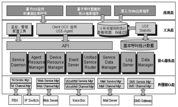青牛USE從體系結(jié)構(gòu)上分為四個(gè)層次。第一層為外圍接口層,負(fù)責(zé)接入、抽象和發(fā)布來(lái)自不同渠道的服務(wù)請(qǐng)求;第二層是核心服務(wù)層,它是青牛USE軟件的核心部分,對(duì)來(lái)自不同渠道的服務(wù)請(qǐng)求和服務(wù)回復(fù)進(jìn)行統(tǒng)一的服務(wù)排隊(duì)管理、資源調(diào)度管理、日志數(shù)據(jù)管理等,屏蔽了不同渠道的物理特性,真正實(shí)現(xiàn)統(tǒng)一路由、統(tǒng)一管理;第三層是工具層,是青牛USE提供給應(yīng)用開(kāi)發(fā)商和集成商的開(kāi)發(fā)接口和配置工具;第四層,USE產(chǎn)品的應(yīng)用層,為呼叫中心應(yīng)提供應(yīng)用功能,比如:呼叫統(tǒng)計(jì)分析、呼叫監(jiān)控等。