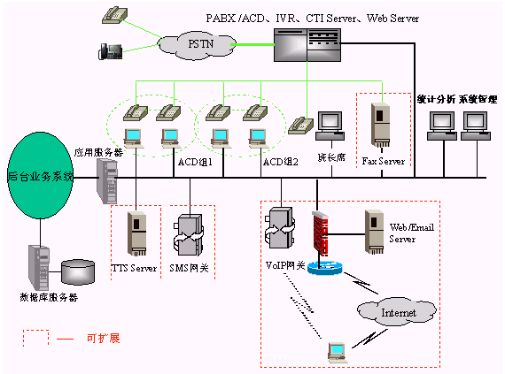 · 一個完整的呼叫中心解決方案通常由以下核心部分組成:自動呼叫分配(ACD)、交互式語音應(yīng)答(IVR)、計算機(jī)電話綜合應(yīng)用(CTI)、錄音服務(wù)器、呼叫管理(CMS)等。