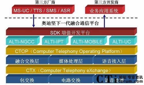 其次,提供業(yè)界領(lǐng)先的CTOP(Computer Telephony Operation Platform)平臺架構(gòu),提供三層架構(gòu),實現(xiàn)融合交換層,媒體處理層和語音接入層,融合交換層實現(xiàn)IP-PBX、ACD、CTI、IVR、CDR、Voice Mail及系統(tǒng)管理等核心功能;媒體處理層實現(xiàn)IP語音媒體處理功能 ,實現(xiàn)對IP語音通道的通話錄音、基礎(chǔ)IVR等功能,實現(xiàn)會議及監(jiān)控資源等功能;語音接入層,實現(xiàn)外線接入、分機連接等傳統(tǒng)語音網(wǎng)關(guān)功能,實現(xiàn)對PSTN外線和模擬分機的通話錄音、基礎(chǔ)IVR等功能 。