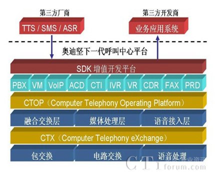奧迪堅 IP 呼叫中心平臺的 CTOP(Computer Telephony Operating Platform) 核心技術(shù)架構(gòu)為業(yè)界最領(lǐng)先的融合交換、媒體處理和語音接入三層平臺應用架 構(gòu)。值得一提的是,這一應用架構(gòu)不僅僅針對交換機部分,而是針對呼叫中心的 PBX、ACD、CTI、IVR、錄音等所有核心功能。它們互相協(xié)同工作、有機整合, 以融合型和分布式的技術(shù)優(yōu)勢實現(xiàn)了呼叫中心應用所需要的各種豐富的功能。