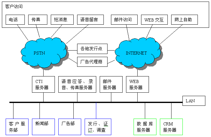 硬件方面,采用價(jià)格經(jīng)濟(jì)、功能靈活的基于語(yǔ)音板卡的呼叫中心平臺(tái)。在軟件方面,采用高可靠性的實(shí)時(shí)LINUX操作系統(tǒng)。具有高效、穩(wěn)定、安全以及功能齊全等特點(diǎn)。坐席端軟件實(shí)現(xiàn)了強(qiáng)大電話處理功能,支持實(shí)時(shí)錄音、兼聽(tīng)、強(qiáng)插、強(qiáng)拆等應(yīng)用。基于瀏覽器的瘦客戶端與CRM的客戶界面完美融合。并且提供詳盡的報(bào)表功能。支持智能化路由、多種排隊(duì)策略的選擇,實(shí)現(xiàn)與CRM無(wú)縫結(jié)合。