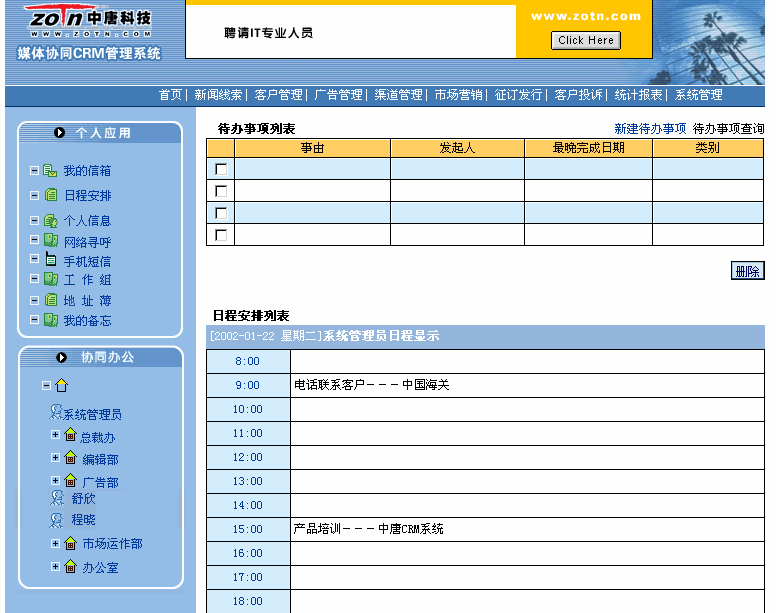 CRM(Customer Relationship Management )即客戶關(guān)系管理系統(tǒng),作為一種全新的運(yùn)營(yíng)管理模式,在各個(gè)行業(yè)正得到日益廣泛的應(yīng)用。媒體行業(yè)作為一個(gè)較為特殊的行業(yè),有著自己獨(dú)特的客戶群體和贏利模式。中唐公司為媒體行業(yè)量身定作了協(xié)同CRM系列產(chǎn)品,分別針對(duì)報(bào)刊雜志、電臺(tái)、電視臺(tái)、網(wǎng)絡(luò)媒體四類媒體單位。