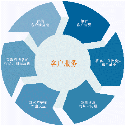 客戶服務不僅限于把公司提供給客戶使用?蛻舴⻊帐桥c客戶交互的一個完整過程,包括聽取客戶的問題和要求,對客戶的需要作出反應并探詢客戶新的需求。我們真的不能將其看成一個簡單的過程。客戶服務可以用一個復雜的循環(huán)來表示,其中不僅僅包括了客戶和客戶服務部門,實際上包括了整個公司,即把公司整體作為一個受客戶需求驅動的對象。