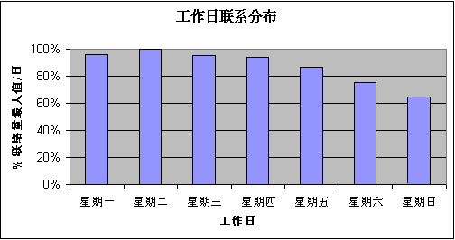 在規(guī)劃客戶服務中心規(guī)模時,最困難的問題之一是:通過時間估計呼叫分配。通過一個 24 x 7 的工作安排,移動電信公司必須按天估計他們將要處理的聯(lián)系量。下圖顯示一個移動電信公司工作日典型的聯(lián)系分布: