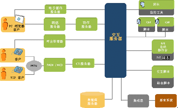 交互(輔助)服務器是客戶服務系統(tǒng)體系結(jié)構的主要組件,控制所有的客戶交互以及它們在座席代表間的分配。其主要功能是: