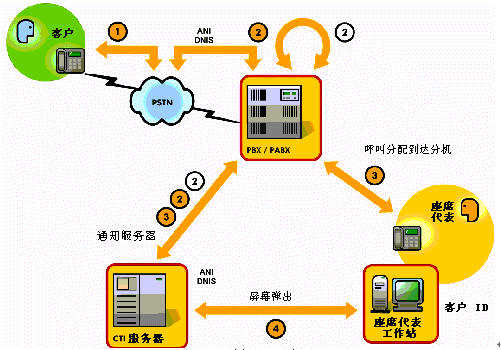 ②呼叫到達業(yè)務交換機并通知服務器(ANI –自動號碼識別)