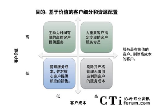 現(xiàn)實情況是,許多采取該策略的公司都僅將基于價值的客戶細分應(yīng)用于高價值、高成本的客戶,而不是應(yīng)用于已有客戶的絕大部分。這是一種不可持續(xù)的商業(yè)行為。然而,許多公司之所以這樣做,是因為公司在所有的客戶細分領(lǐng)域,無視價值高低,不加區(qū)分的投入成本和服務(wù),會存在風(fēng)險,即讓服務(wù)更多的投入到價值不高,卻又經(jīng)常呼入的客戶上,從而忽視了一些更有