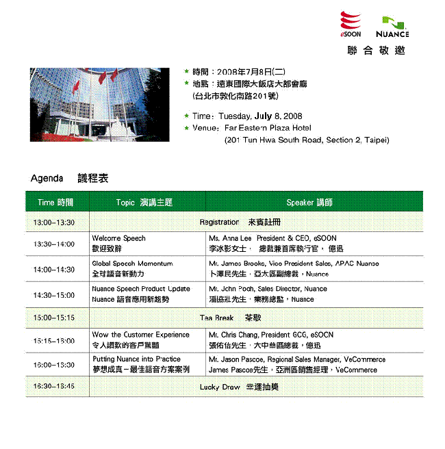 2008“Nuance語音技術(shù)高峰論壇”臺北站7月8日將于遠東國際大飯店舉行