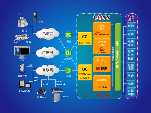 上圖: 三網(wǎng)融合下億迅的新一代客服中心可實現(xiàn)多元企企聯(lián)盟的商務(wù)活動