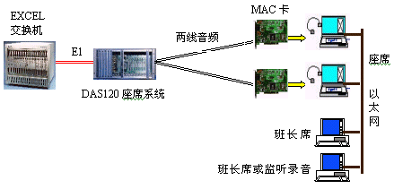 DAS120與億景座席卡MAC配合使用,可使系統(tǒng)的優(yōu)越性發(fā)揮到最大。MAC卡提供的強(qiáng)大功能(收發(fā)DTMF和450HZ信號音,語音錄放等)有效地簡化系統(tǒng)軟件的設(shè)計(jì),并可降低系統(tǒng)成本,如EXCEL交換機(jī)可不用配置DSP卡,IVR可簡化等。還可以有效地降低交換機(jī)的處理負(fù)荷,提高話務(wù)處理能力。