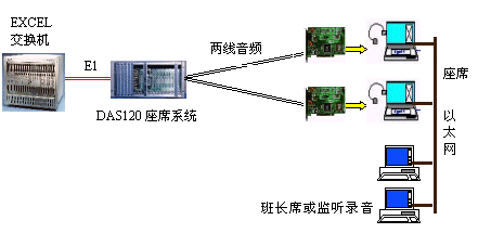 因?yàn)镋XCEL交換機(jī)不能提供模擬接口。DAS120的出現(xiàn)很好地彌補(bǔ)了其不足。它與EXCEL交換機(jī)采用4個(gè)E1連接,可以簡潔實(shí)現(xiàn)PCM信號轉(zhuǎn)模擬信號引出到座席。E1接口的信令可選配為隨路信令CAS和透明通道Clear