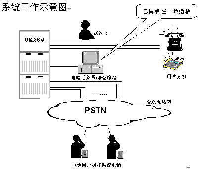 該系統(tǒng)可作為程控交換機(jī)銷(xiāo)售商的配套模塊配給新用戶,也可用于電力、院校、企業(yè)集團(tuán)、政府機(jī)關(guān)等已擁有交換機(jī)的單位加配電腦話務(wù)員和語(yǔ)音信箱及114查號(hào)臺(tái)功能。