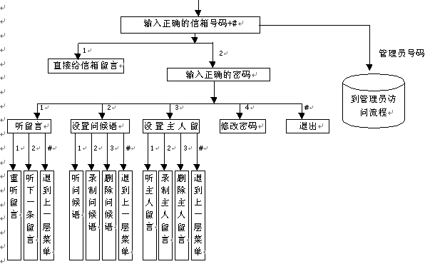 作為信箱主人的用戶既可以象其它普通用戶一樣進(jìn)行普通用戶訪問(wèn)(指訪問(wèn)其它分機(jī)、給其它分機(jī)主人留言等),還可以使用系統(tǒng)專(zhuān)門(mén)提供的主人訪問(wèn)服務(wù)功能。