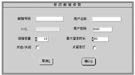 1). 您可修改的參數(shù)有:用戶名稱(chēng)、用戶密碼、信箱容量、最大留時(shí)長(zhǎng)、開(kāi)啟/關(guān)閉、點(diǎn)留言燈。有關(guān)參數(shù)的細(xì)節(jié)將在增加信箱一節(jié)中介紹。