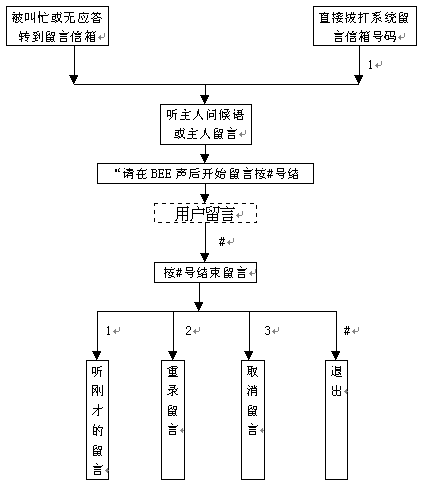 3). 若輸入的分機(jī)信箱號(hào)碼正確,此時(shí)系統(tǒng)會(huì)提示用戶"留言請(qǐng)按1,主人訪問(wèn)請(qǐng)按2",按1后即可給該信箱留言。