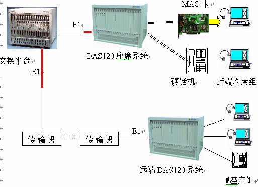 DAS120交換平臺(tái)采用1-4個(gè)E1連接,可以簡(jiǎn)潔實(shí)現(xiàn)PCM信號(hào)轉(zhuǎn)模擬信號(hào)引出到座席。E1接口的信令可選配為隨路信令CAS和透明通道Clear Channel。E1可通過光端機(jī)、微波、HDSL等設(shè)備來傳輸,從而實(shí)現(xiàn)分布式組網(wǎng)。