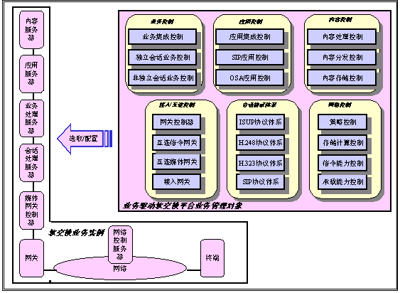 我們已經(jīng)看到,軟交換技術(shù)支持的電信業(yè)務(wù)能力一直在不斷發(fā)展,開發(fā)新的電信業(yè)務(wù)已經(jīng)成為電信運營商市場競爭的重要條件。事實上,業(yè)務(wù)能力是電信運營商或是電信用戶關(guān)心的基本問題,而不是實現(xiàn)這種業(yè)務(wù)的具體的技術(shù)和體系結(jié)構(gòu)。選擇何種技術(shù)和結(jié)構(gòu),則是電信運營商依據(jù)自有的資源做出的選擇。因此,業(yè)務(wù)驅(qū)動的軟交換平臺需要根據(jù)實際的情況選取合適的技術(shù)和結(jié)構(gòu)實現(xiàn)所需的業(yè)務(wù)。我們把實現(xiàn)電信業(yè)務(wù)中涉及的要素稱為業(yè)務(wù)管理對象。軟交換平臺涉及到以下的六類業(yè)務(wù)管理對象:會話協(xié)議體系、接入/互連控制、業(yè)務(wù)控制、應(yīng)用控制、內(nèi)容控制和網(wǎng)絡(luò)控制。會話協(xié)議體系是任何電信業(yè)務(wù)的基礎(chǔ)。對接入、互聯(lián)、業(yè)務(wù)、應(yīng)用和內(nèi)容的控制也是建立電信業(yè)務(wù)所必需的。網(wǎng)絡(luò)控制涉及到一個新業(yè)務(wù)和網(wǎng)絡(luò)全局的關(guān)系。除了平臺管理業(yè)務(wù)之外,每個業(yè)務(wù)管理對象均包含一個可選擇/可設(shè)計的集合,供業(yè)務(wù)設(shè)計時使用。所有這些業(yè)務(wù)管理對象的集合,構(gòu)成了業(yè)務(wù)驅(qū)動軟交換平臺的控制功能的整體。下圖給除了業(yè)務(wù)驅(qū)動軟交換平臺上的業(yè)務(wù)管理對象,以及從這些業(yè)務(wù)管理對象映射的軟交換系統(tǒng)實例。