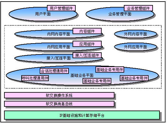 從結(jié)構(gòu)上看,業(yè)務(wù)驅(qū)動的軟交換平臺是一個復(fù)雜的多域多層組件平臺。一個電信業(yè)務(wù)的實現(xiàn)是對平臺上的組件的組裝過程。業(yè)務(wù)驅(qū)動的軟交換平臺上的組件分為用戶平面、基礎(chǔ)業(yè)務(wù)平面、接入/互連/移動控制平面、應(yīng)用平面、內(nèi)容平面和業(yè)務(wù)管理平面。用戶平面的組件負責(zé)維護用戶的注冊信息、位置信息、狀態(tài)信息、業(yè)務(wù)信息和業(yè)務(wù)使用信息。基礎(chǔ)業(yè)務(wù)平面的組件分為三大類型:電路基礎(chǔ)業(yè)務(wù)、包交換基礎(chǔ)業(yè)務(wù)和多媒體交換基礎(chǔ)業(yè)務(wù)。每個基礎(chǔ)業(yè)務(wù)分成傳輸層、承載層、媒體層、呼叫處理層和業(yè)務(wù)層,其中的控制包括了對各層功能的控制協(xié)議和層間交互的控制協(xié)議。接入/互連/移動控制平面中包含了對各種接入網(wǎng)絡(luò)的控制、對互聯(lián)網(wǎng)絡(luò)的控制和對移動性的控制協(xié)議,也分成傳輸層、承載層、媒體層、呼叫處理層和業(yè)務(wù)層的控制組件。應(yīng)用平面的組件分為三種類型,基于傳統(tǒng)智能網(wǎng)(IN,