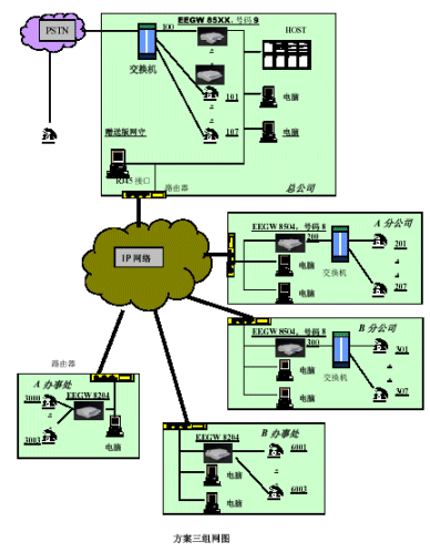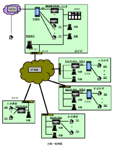 。。本方案有主要配置:總公司配備3臺EEGW8504FXO網(wǎng)關(guān)、四個分公司分別配備1臺EEGW8504FXO網(wǎng)關(guān),四個辦事處分別配備1臺EEGW8204FXO網(wǎng)關(guān)。在總公司出可以安裝EEGK8001簡易網(wǎng)閘。