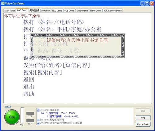 Nuance:可以修改。到你需要修改的那個(gè)“見”上,你再說“見”或者見面,它就給你弄過來了。但是我們覺得在中國區(qū),在中文的修改上,這未必可能是個(gè)好辦法,我們也在試探另外一種辦法,這個(gè)辦法我現(xiàn)在可以給大家介紹一下。就是這樣,我要說修改,那么那個(gè)語音合成TS就開始給你再讀,剛才不是讀了一遍嗎,它再給你讀,但是這一次讀,它是一個(gè)詞一個(gè)詞地讀。他說,今天我不吭聲,晚上,我不吭聲,他說七點(diǎn),我也不吭聲,等他說“見”的時(shí)候,我說“見面”,他知道我說的這個(gè)詞要把那個(gè)覆蓋掉,再改,再把它改了。這樣可能更合理一些,就是你手不用去摸什么東西,眼睛看什么東西,完全能保持你在駕駛的時(shí)候,這是我們目前還在進(jìn)行開發(fā)的一個(gè)東西,或許下一次如果我們再有機(jī)會我們就可以把這個(gè)演示一下。