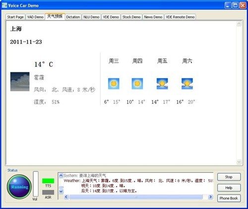 比方說這個(gè)關(guān)于空調(diào)問題,我們過去,空調(diào)的命令詞是“把空調(diào)打開,空調(diào)溫度提高3度!爆F(xiàn)在我也可以這樣說,空調(diào)調(diào)高一點(diǎn),我有點(diǎn)冷,也可以。就是你在車?yán)镞呁耆梢杂媚阕约旱恼Z言來說你想干的事。比如說,前邊你不知道明天天氣會怎么樣,人一般都會想想,明天天氣如何,或者是告訴我天氣預(yù)報(bào)。但是你也可以這樣說。明天會下雨嗎?也可以這樣說;蛘吣氵@樣說,你說,今天大盤怎么樣。完全是用自然語言來說。堵不堵車,“查詢交通情況!边@就是,實(shí)際上可以有各種不同的說法來完成這個(gè)任務(wù),這是我們自然語言的一個(gè)演示。