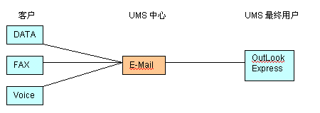 UMS的起源可追溯到數(shù)據(jù),傳真和語音三大應(yīng)用的整合,即統(tǒng)一為E-Mail形式,在企業(yè)內(nèi) 部或INTERNET郵件系統(tǒng)轉(zhuǎn)發(fā)。實(shí)現(xiàn)起來也較簡(jiǎn)單,如下圖所示: