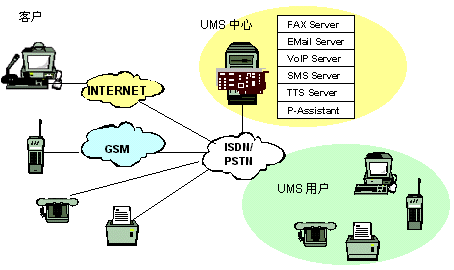 客戶用電子郵件、語音、尋呼、移動(dòng)短消息、傳真等與UMS用戶聯(lián)系,UMS中心啟動(dòng)相應(yīng)的服務(wù)與客戶建立連接,將客戶所發(fā)信息按識(shí)別標(biāo)識(shí)直接轉(zhuǎn)發(fā)到UMS用戶或中繼服務(wù)器,若因UMS用戶不在等原因,無法直接聯(lián)系,系統(tǒng)會(huì)提示客戶選擇別的方式聯(lián)系。也可將其存儲(chǔ),并進(jìn)行必要的格式轉(zhuǎn)換與管理,這時(shí)UMS中心可以主動(dòng)呼叫UMS用戶的手機(jī),傳真機(jī),電話等主動(dòng)將信息送到,UMS用戶也可以在任何時(shí)間、任何地點(diǎn),從固定電話網(wǎng)(普通電話、傳真機(jī)、IC卡電話等)、移動(dòng)網(wǎng)(GSM、模擬、CDMA、WAP手機(jī)、掌上電腦、PDA等)、尋呼網(wǎng)、互聯(lián)網(wǎng)(PC)訪問中心服務(wù)器查詢,索取個(gè)人信息。