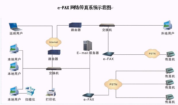 e-FAX網(wǎng)絡傳真機 的工作原理是利用內部設備對傳真和語音信號的存儲及轉換功能,在網(wǎng)絡配置許可的范圍內 , 主要實現(xiàn)了自動接收和發(fā)送傳真的功能。系統(tǒng)內用戶能通過電子郵件和網(wǎng)頁方式收取自己的傳真或語音,發(fā)送傳真時只需要提交傳真給傳真服務器,服務器能自動發(fā)送。系統(tǒng)外用戶能在語音流程的提示下發(fā)送或接收傳真,也可以選擇發(fā)送留言信息。系統(tǒng)管理員則可以對系統(tǒng)進行參數(shù)配置,流程定制和用戶信息管理等功能操作。