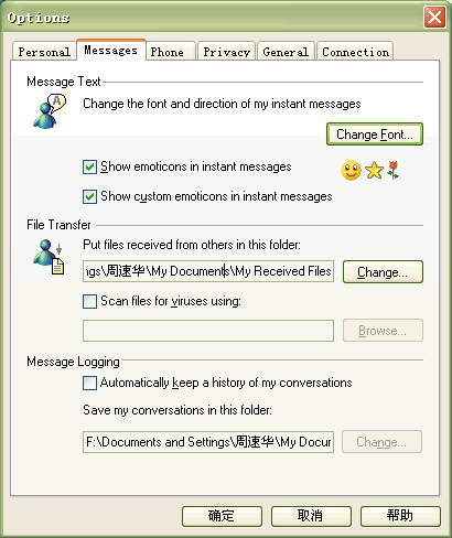 Messenger 6.0必須在個人選項中進行設置后才可以自動保存聊天記錄,默認是不支持的。