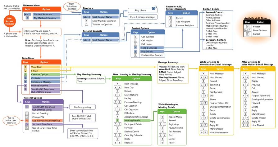 允許用戶通過(guò)電話處理他們的消息和日歷數(shù)據(jù)(包括收聽(tīng)、轉(zhuǎn)發(fā)和回復(fù)電子郵件,以及發(fā)出、更新或響應(yīng)會(huì)議請(qǐng)求)。用戶可以標(biāo)記消息以便跟蹤、跳到下一封未讀郵件、隱藏或刪除對(duì)話,甚至查找來(lái)自特定用戶的消息,這一切全都使用語(yǔ)音導(dǎo)航或標(biāo)準(zhǔn)按鍵式鍵盤來(lái)完成。