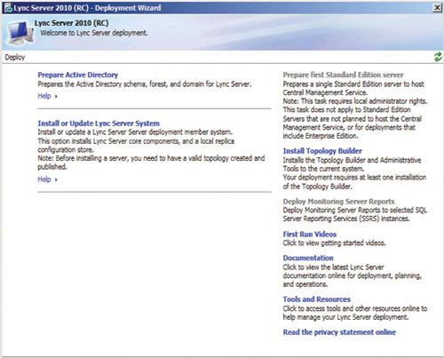 準(zhǔn)備好基礎(chǔ)結(jié)構(gòu)并發(fā)布拓?fù)浜,即可開(kāi)始安裝前端服務(wù)器和服務(wù)器角色,以啟用 A/V 會(huì)議、企業(yè)語(yǔ)音、監(jiān)控、存檔及其他功能。準(zhǔn)備每臺(tái)服務(wù)器從運(yùn)行部署向?qū)В▍⒁?jiàn)圖 3)開(kāi)始,但每個(gè)服務(wù)器角色都有自己的安裝和配置要求。您可以在 TechNet 庫(kù)的“部署 Lync Server 2010 Standard Edition”部分查找更多詳細(xì)信息。